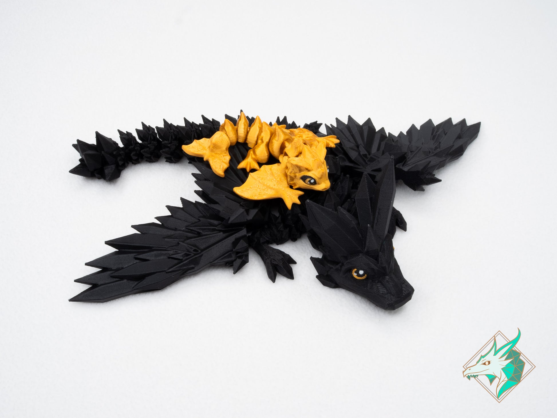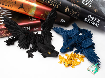 The Dynamic Duo consists of a young winged matte black crystaldragon and a small golden dragon, who are based on Tairneanach and Andarnaurram, the dragons bonded to the main character Violet Sorrengail.